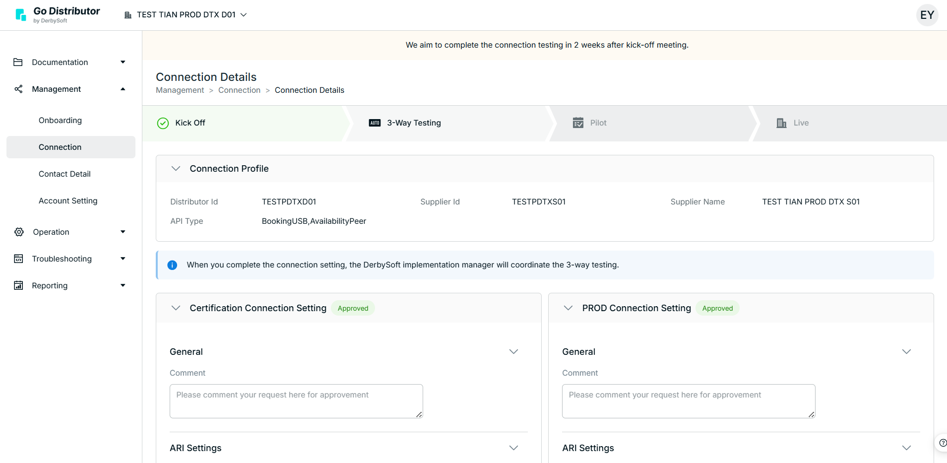 3-way testing in the production environment is desired before going live. Please fill out the sales window as agreed with the supplier.