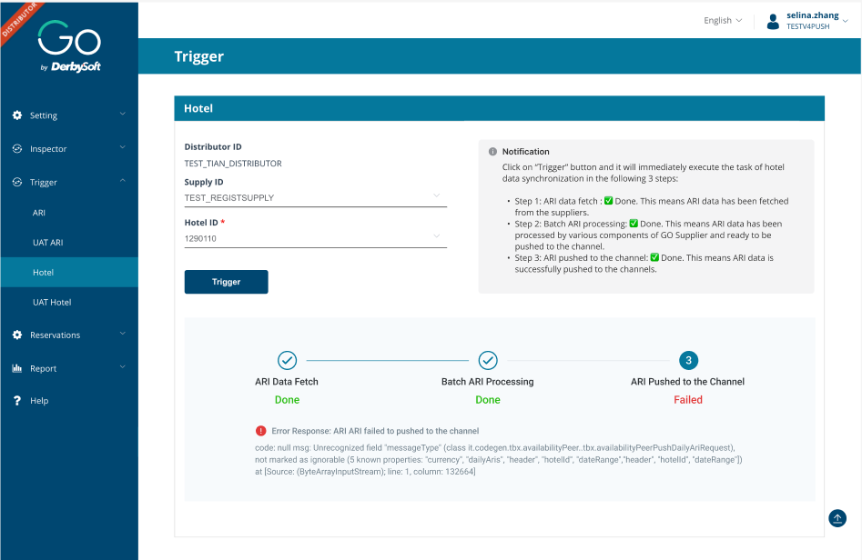The “Trigger ARI” is used when the distributors want to receive the most updated ARI from DerbySoft cache. After it is executed the result will return “Success”, “Error” or “Warning”. The warning message is returned for various reasons and sometimes causes confusion to our customers. To improve this we have refined the messages and showed the logs in several steps.