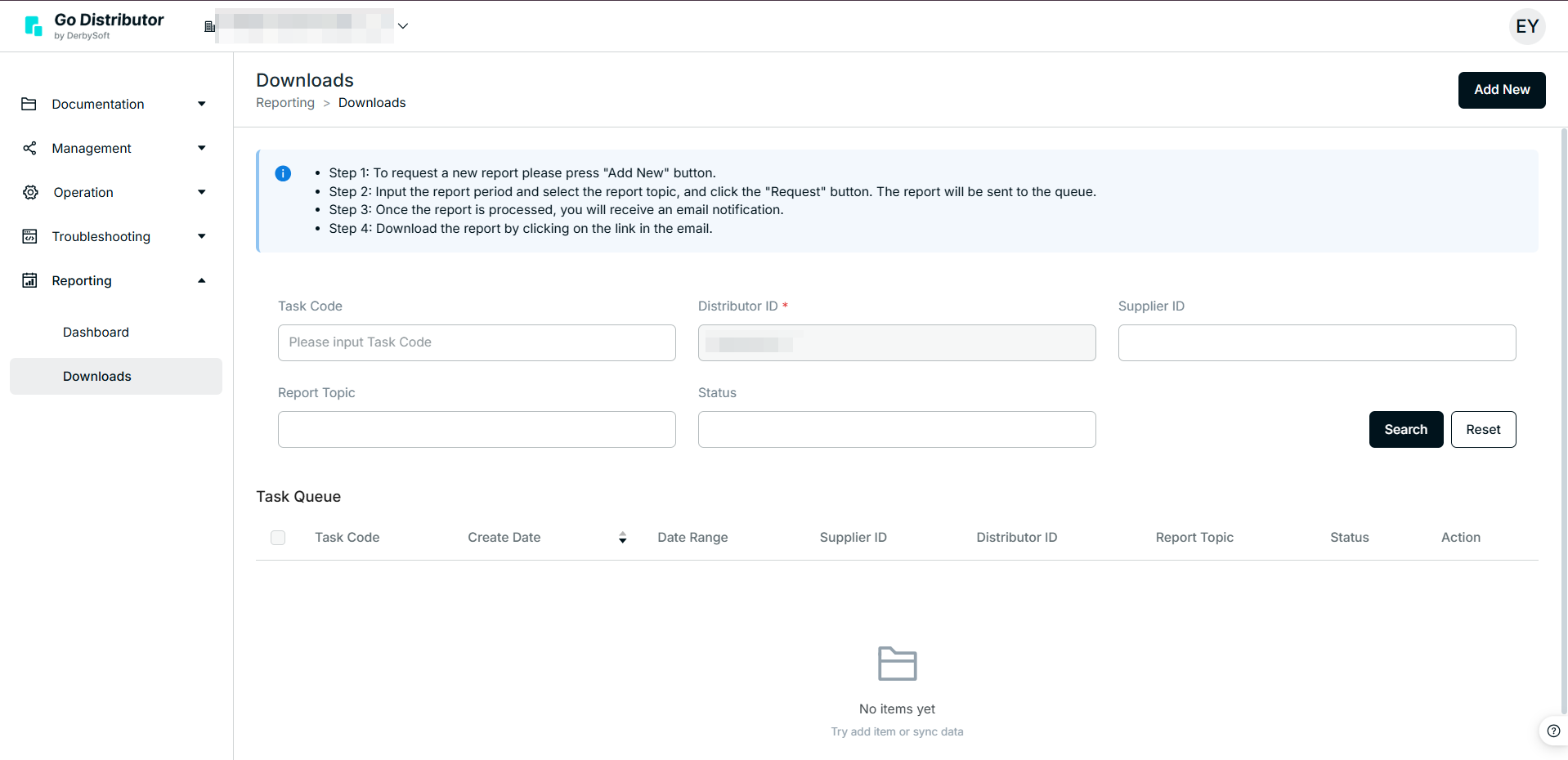 - Step 1: To request a new report please press the "Add New" button.