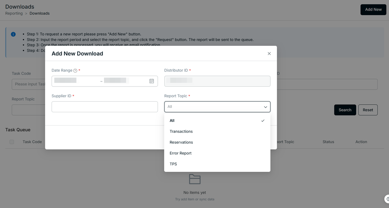 - Step 2: Input the reporting period, select the report topic, and click the "Request" button. The report will be sent to the queue.