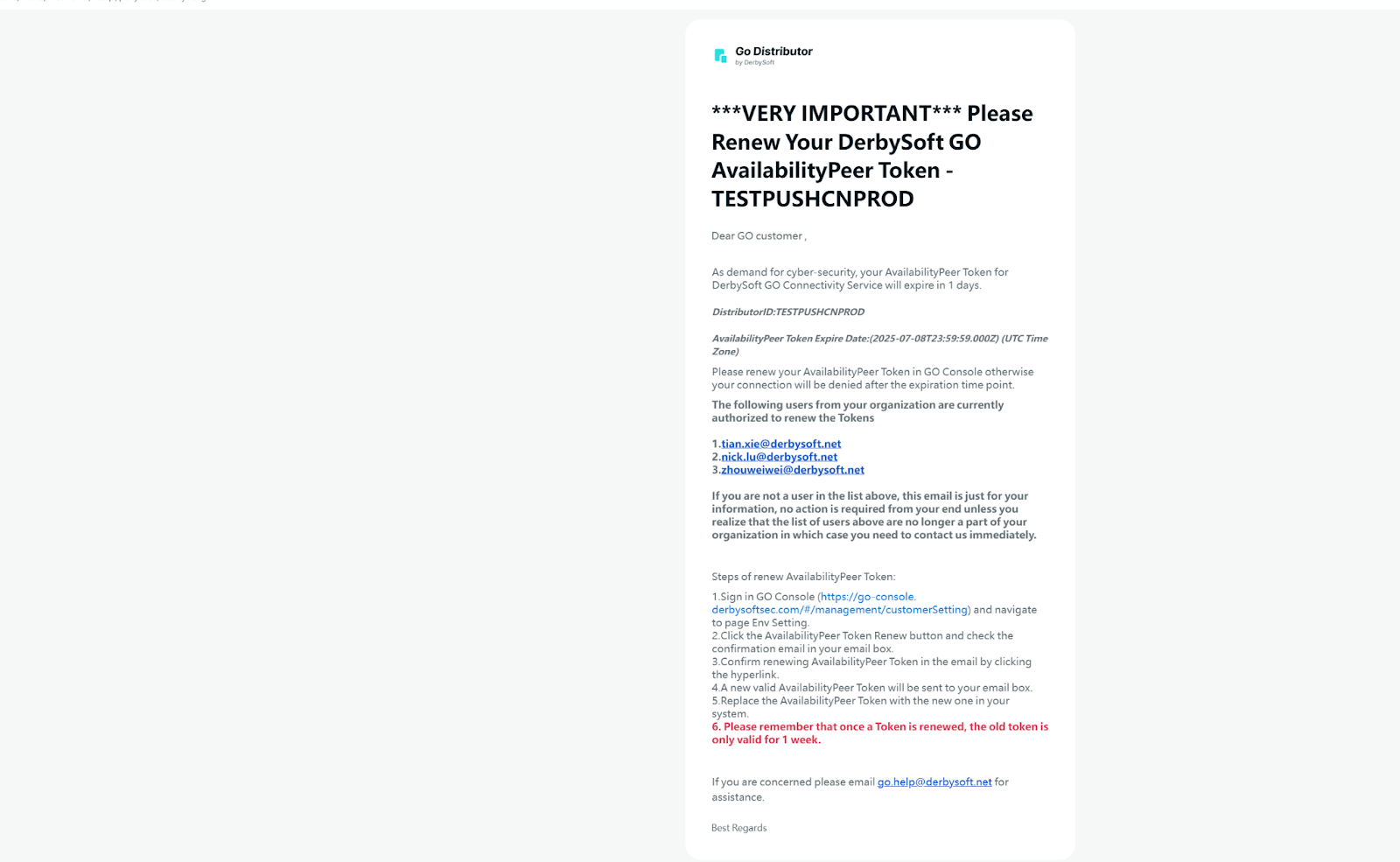 Renewal emails now explicitly state the validity period of expiring tokens to prevent system access failures due to outdated credentials.